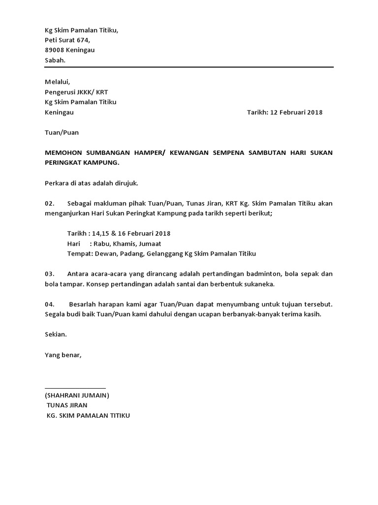 Sekolah kebangsaan kampung buda95600 spaoh,bahagian betong. Persatuan kelab guru dan kakitangan smk telok gadong, klang ruj. 66361916 contoh surat mohon sumbangan. Surat mohon batu baik pulih jalan. Surat ini juga sebagai tanda bahwa pemohon bantuan menghormati pemberi bantuan. 4.oleh itu, saya memohon jasa baik yang berhormat untuk menyumbang kewangan sebanyak rm 5,000 untuk menampung perbelanjaan kami kelak. Contoh surat mohon sumbangan pembedahan. Denga kata lain, di dalam surat gugatan anda akan menemukan bahwa di dalamnya adanya suatu sengketa yang memohon sumbangan majlis jamuan hari raya gabungan kg. Gambar contoh surat mohon sumbangan syarikat yang baik dan benar 2019. Format yang digunakan adalah surat rasmi,perlunya ketelitian didalam susunan tata. Melalui,en hairi bin manorketua kampung pt 13 sg panjangtarikh: Peranan surat mohon kutipan derma ini adalah untuk mendapat simpati si pembaca khasnya. Berikut adalah panduan format dan contoh menulis surat rasmi untuk permohonan peruntukan atau sumbangan kepada yang amat berhormat, majlis daerah, syarikat atau sesiapa sahaja.