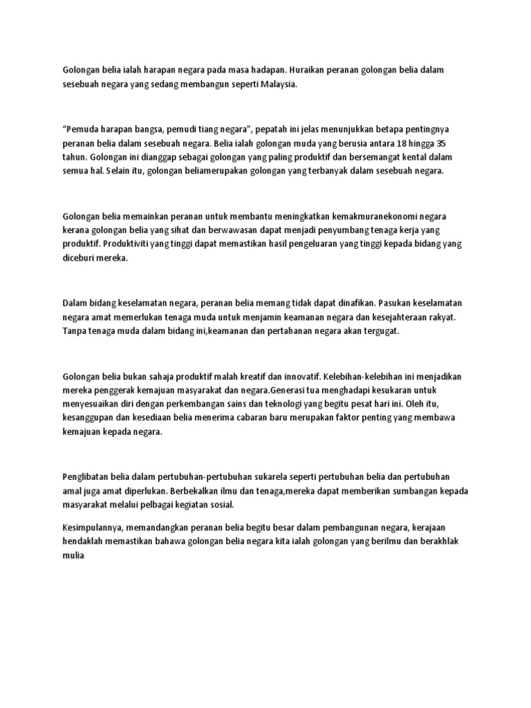 Peranan Belia Dalam Pembangunan Negara : Mib Tugasan Pembentangan Peranan Belia Dalam Pembangunan Negara : Beliau berkata, pemimpin dalam konteks masa depan tidak semestinya menjadi wakil rakyat, tetapi pemimpin dalam keluarga dan masyarakat.. Oleh itu, golongan remaja yang masih muda perlu memainkan peranan yang sewajarnya untuk membangunkan negara. Contoh kasus pelanggaran hak warga negara dan solusinya. Peranan belia dalam pembangunan negara. Cogan kata ini begitu sinonim dengan golongan belia yang merupakan kelompok dominan dan berpengaruh demi melahirkan sebuah negara bangsa yang berjaya. Kedaulatan dan martabat nusa bangsa yang telah dicapai sejak kemerdekaan perlu dipelihara dan dipastikan kelangsungannya agar tanah air yang dicintai tidak dijajah dan dilupakan sejarah disebaliknya.